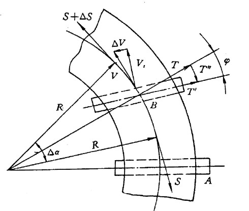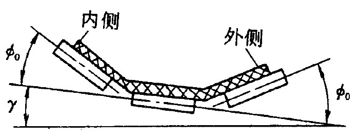 1.构成内曲线抬高角。输送带在转弯处的内侧边所形成的曲线叫内曲线,而另一侧边叫外曲线。由于内曲线抬高,中间托辊轴线与水平面的夹角称内曲线抬高角,其目的是减小转弯半径,则易于实现平稳转弯,当然愈大可使转弯半径愈小,但过大会使输送物料向外侧滚动导致洒料。理论及实践证明抬高角。