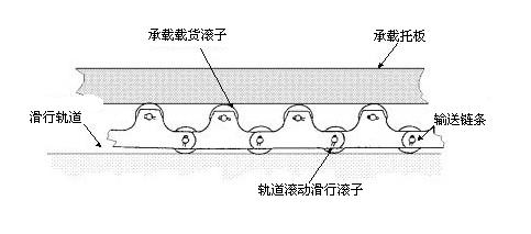 滚动式链条输送机是在承载链条上,每目之间再加装上一较高之承载滚子附件来承载货物。而链条是以滚子来与轨道滚动滑行。由于链条上之滚子与轨道是以滚动接触,摩擦阻力小,动力损耗低且可承载较重的荷重。其荷重能力与支架强度、链条大小及滚子尺寸、材质均有关系,而滚子材质一般为钢制,但有些场合为了降低噪音,而采用耐磨耗之工程塑料制造。另外承载货物之滚子与承载托板间,在输送堆积时会产生滑动及滚动两种方式接触,亦即当一般输送情况,货物在承载托板上,承载托板与承载滚子间因荷重产生摩擦力之故,而随着链条向前输送,一但承载托板堆满线后,则承载托板与承载滚子间便成打滑现象,而使滚子空转,链条继续向前移动,如此便可达到区段储积功能,而不需停止输送机。